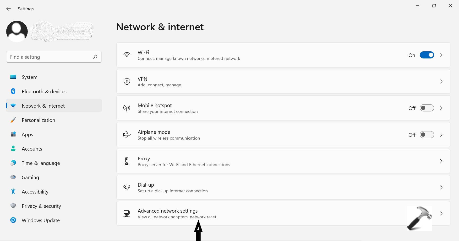 2. Kattintson a gombraHálózat és internetA bal oldali ablaktáblából.