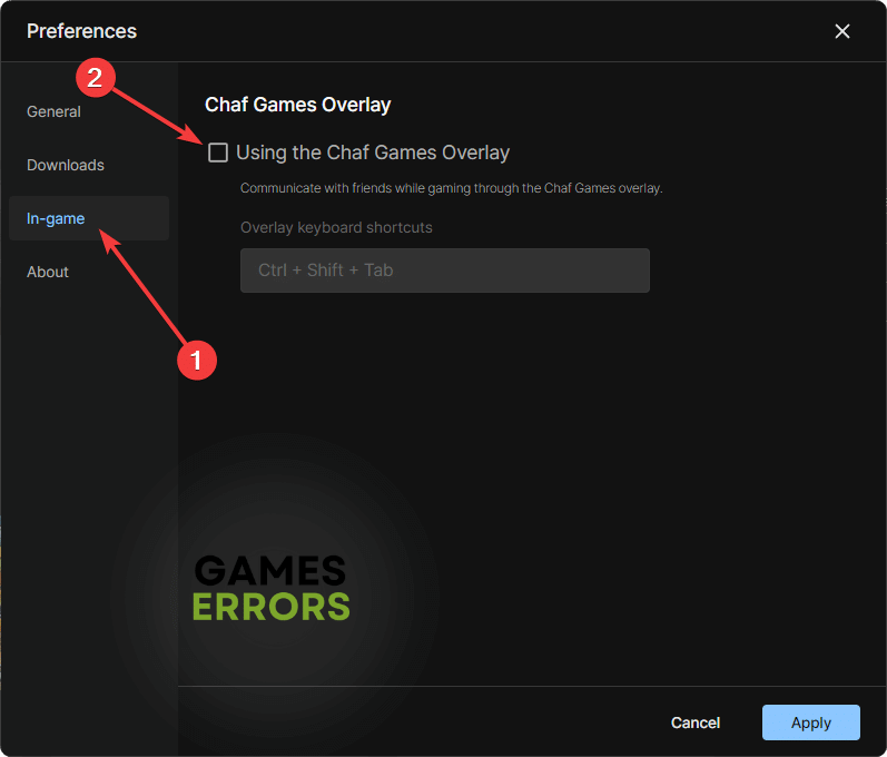 - Menj aJátékon belülfület, majd törölje a jelöléstA Chaf Games Overlay használata.