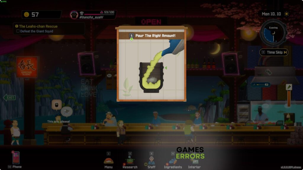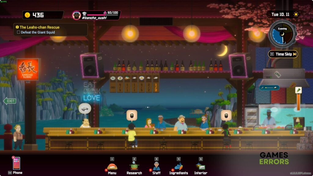 Dave the Diver -ben az időgazdálkodás fontos dolog. Miután elkezdi a fejlődést, és az étterem több vendéget kezd, gyakran kihívást jelent, hogy időben kiszolgálja őket. Ha ezt elmulasztja, a vendégek csalódottak lesznek, és elhagyják az éttermet. Tehát mindig próbálja ki kiszolgálni azokat, akik korábban élelmet vagy italt kérnek, miközben szemmel tartják mások mentális státusát.