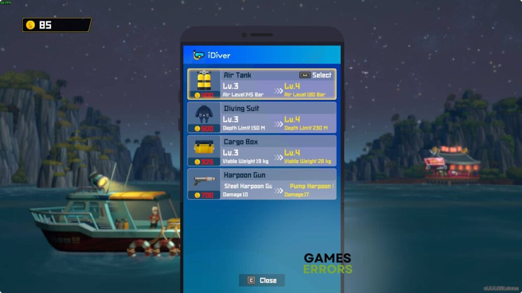 Az RPG lejátszása közben gyakran érméket fogsz keresni. Használja őket a berendezések, különösen a búvárruhák, a légdoboz és a rakománydoboz frissítéséhez. Ez a három dolog lehetővé teszi, hogy mélyebben menjen, hosszabb ideig a víz alatt maradjon, és több tárgyat hozzon a tengerből. Az összes többi berendezésnek végül is frissítést igényel. De ezek a legfontosabb dolgok.