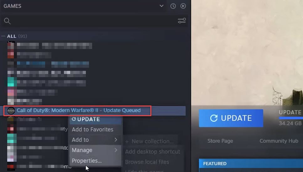 A mindig automatikus frissítés beállításához kattintson jobb gombbal az MW2-re, és válassza kiTulajdonságok.