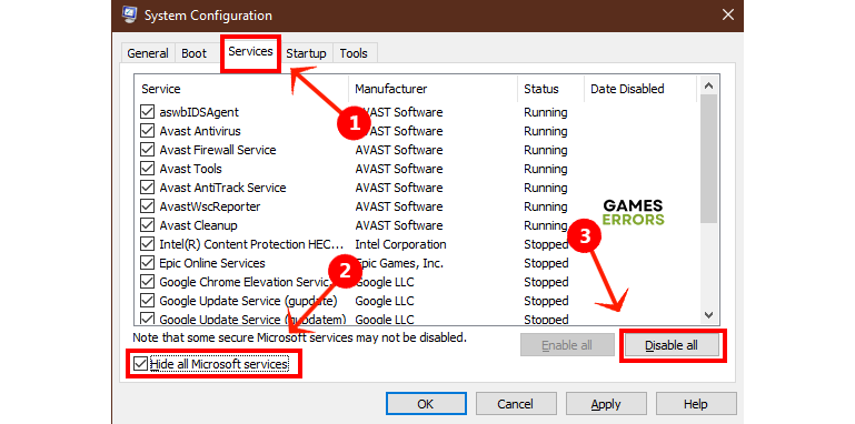 - Kattintson aSzolgáltatásfül és menj leElrejtse az összes Microsoft szolgáltatástdoboz, ellenőrizze.