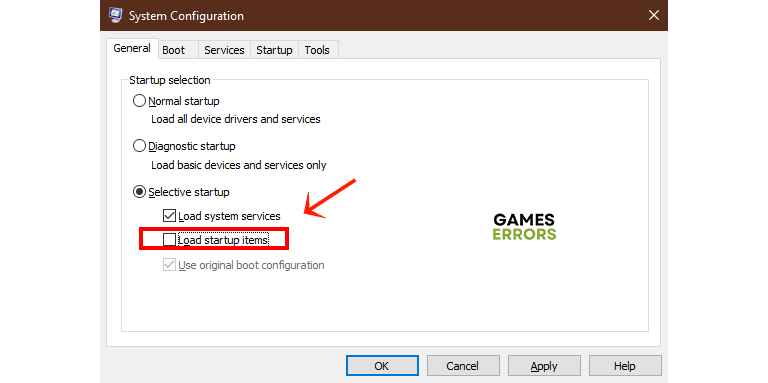 - Törölje a jelölést aTöltse be az indítási elemeketdoboz.