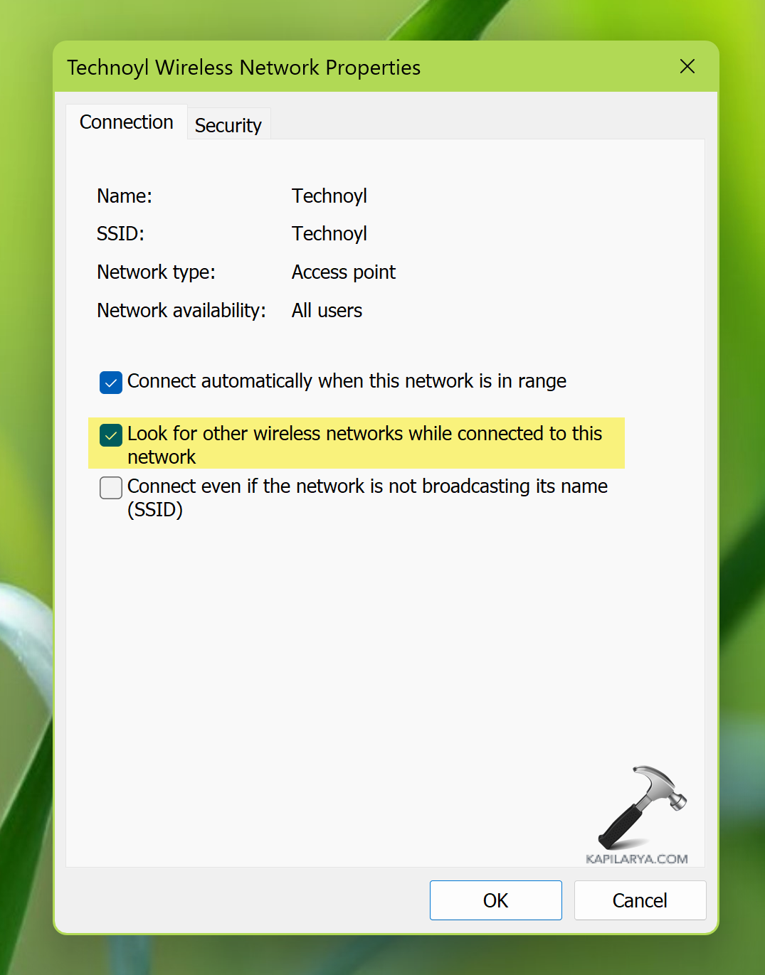 5. A hálózat tulajdonságai lapon jelölje be a Keressen más vezeték nélküli hálózatokat, miközben ehhez a hálózathoz csatlakozik jelölőnégyzetet. Kattintson az Alkalmaz, OK gombra.