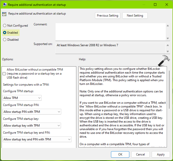 4.A házirend-konfigurációs ablakban válassza a lehetőségetEngedélyezve. A beállítások alatt törölje a jelöléstA BitLocker engedélyezése kompatibilis TPM nélkül. A többi beállítást hagyja alapértelmezés szerint úgy, ahogy van. Kattintson az Alkalmaz, majd az OK gombra.