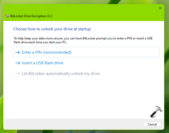 7.A Meghajtó feloldásának módja indításkor területen kattintson a gombraPIN kód megadása (ajánlott).
