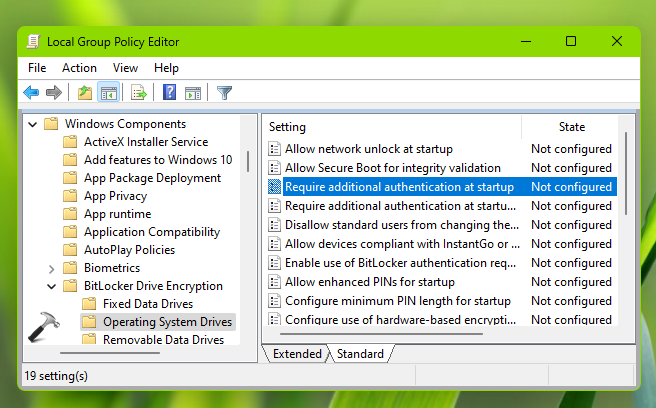 3.Az Operációs rendszer-meghajtók jobb oldali ablaktáblájában keresse meg a nevezett házirend-beállítástIndításkor további hitelesítés szükséges. Alapértelmezés szerint ez a házirend nincs konfigurálva. A házirend-beállításra duplán kattintva módosíthatja azt.