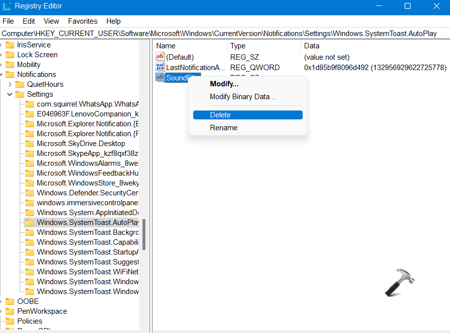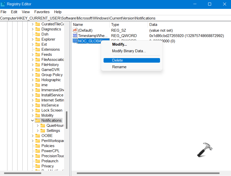 HKEY_CURRENT_USERSoftwareMicrosoftWindowsCurrentVersionNotificationsSettings