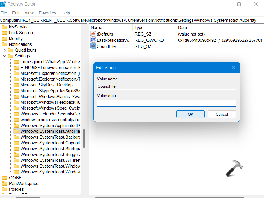 4.Most kattintson duplán aHangfileReg_sz, és hagyja üres érték adatait. Miután kész, nyomja meg az OK gombot. Ez letiltja az értesítési hangokat a Windows 11 -ben.