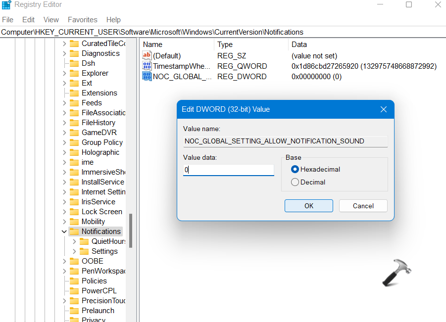 3.Ha egyszer ott van, kattintson duplán aNoc_global_seting_allow_notification_soundReg_dword, és változtassa meg értékadatait0- Ez letiltja az értesítési hangokat a Windows 11 -ben.