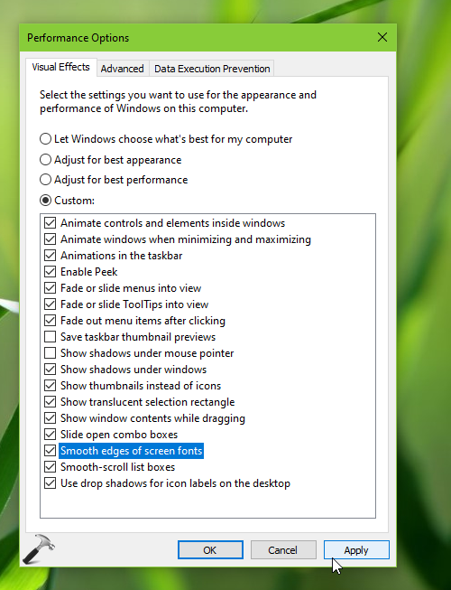 3.Ezután a Teljesítménybeállítások ablak Vizuális effektusok lapján válassza ki a lehetőségetSzokás. Ezután törölje a pipátA képernyő betűtípusának sima széleivagy jelölje be ugyanazt a lehetőséget, hogy engedélyezze a betűtípus simítását, amely szintén az alapértelmezett beállítás. KattintsonAlkalmazni,RENDBEN.