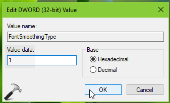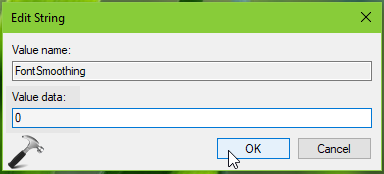 4.Állítsa az Érték adatot értékre0a betűsimítás letiltásához. KattintsonRENDBEN. Hasonlóképpen kattintson duplán a gombraFontSmoothingTyperegisztrációs duplaszó (REG_DWORD), és állítsa be az értékadatait erre1, ismét a betűsimítás letiltásához. KattintsonRENDBENés zárja be a Rendszerleíróadatbázis-szerkesztőt.