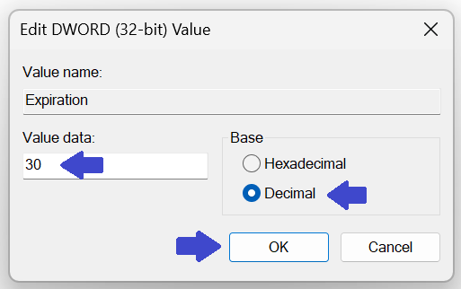 Kattintson duplán kattintsonPincomplexitás=> Új => DWORD (32 bites) érték. Írja be a lejáratot, és kattintson az OK gombra.