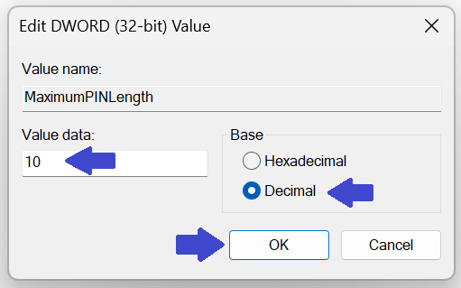 Válassza ki a tizedes értéket, és állítsa az értéket 10 -re. Kattintson az OK gombra.