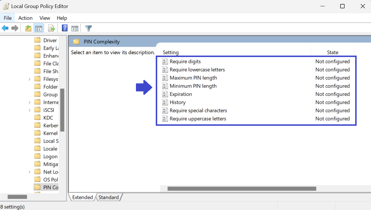 - Kisbetűket igényel: Használja ezt a házirend -beállítást a kisbetűk használatának konfigurálásához a PIN -ben.
