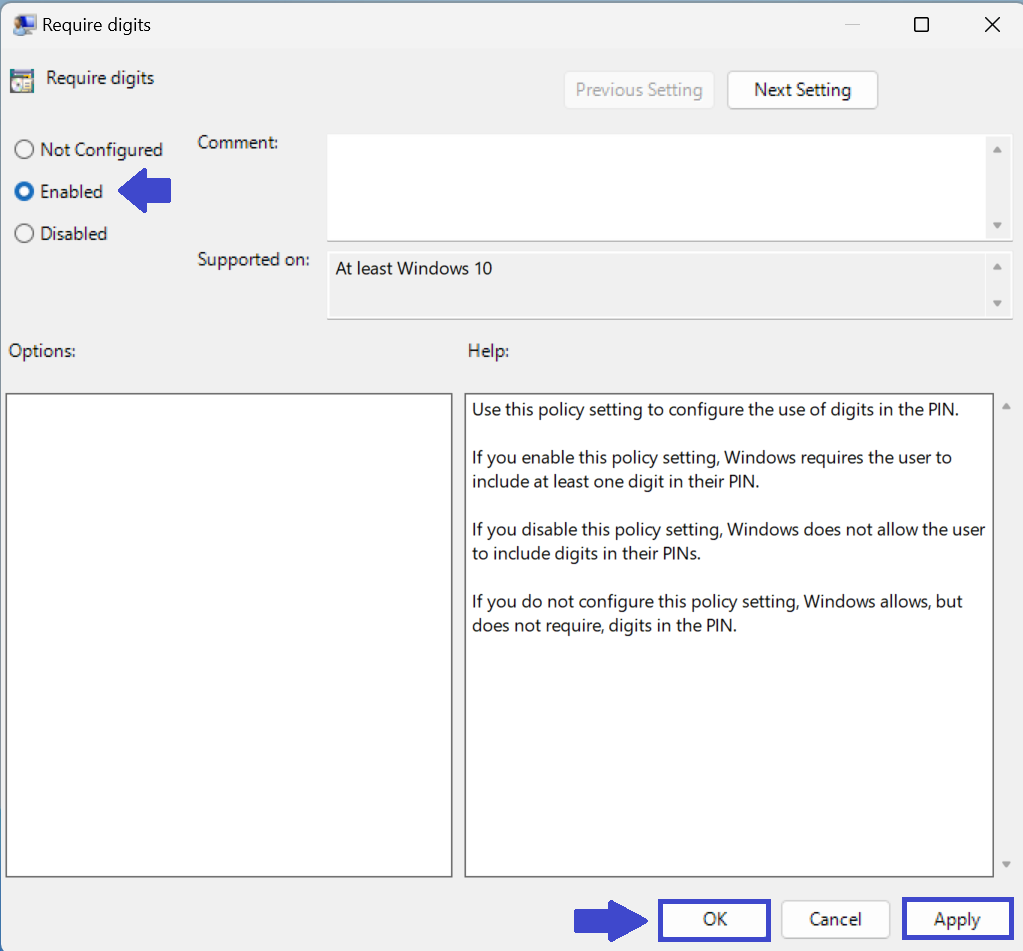- Számjegyeket igényel: Ezzel a házirend -beállítással konfigurálhatja a számjegyek használatát a PIN -ben.