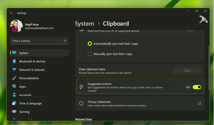 3.Vágólap alatt keresse megJavasolt cselekedetek- FordulatOnA szolgáltatás engedélyezéséhez a megfelelő opció. Vegye figyelembe, hogy a javasolt műveletek alapértelmezés szerint be van kapcsolva a Windows 11 -ben, de abban az esetben, ha nem be van kapcsolva, használhatja ezt a fület.