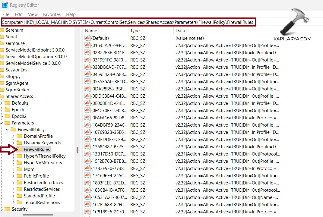 5. Térjen vissza az előző FirewallRules-kulcsexportáláshoz. Másolja ki a tűzfalszabályokat tartalmazó sort az exportáláshoz.