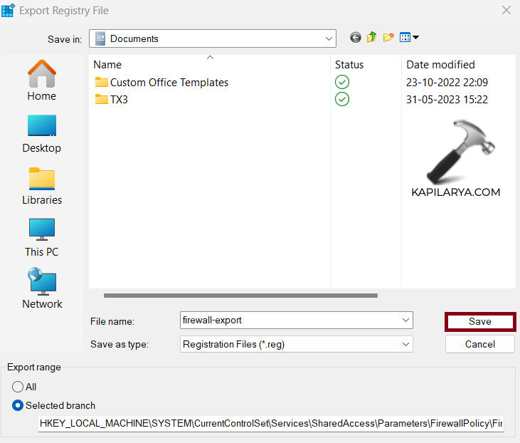 4. Írja be a .reg fájl nevét (tűzfal-exportként mentettem), és kattintson a „Mentés” gombra.