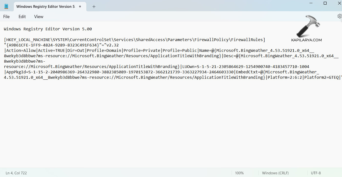 Most ez az exportált fájl tartalmazza a tűzfalszabályokat. A következő lépés az, hogy nyissa meg ezt a fájlt a Jegyzettömbbel, hogy eltávolítsa a nem szükséges bejegyzéseket, és hozzon létre egy új .reg fájlt, amely csak a rendszerbe importálni kívánt bejegyzéseket tartalmazza.