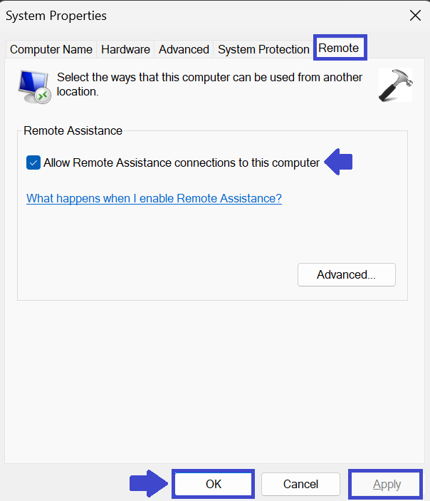 Ellenőrizze a „Távoli segítségnyújtási kapcsolat engedélyezése ehhez a számítógéphez” lehetőséget.