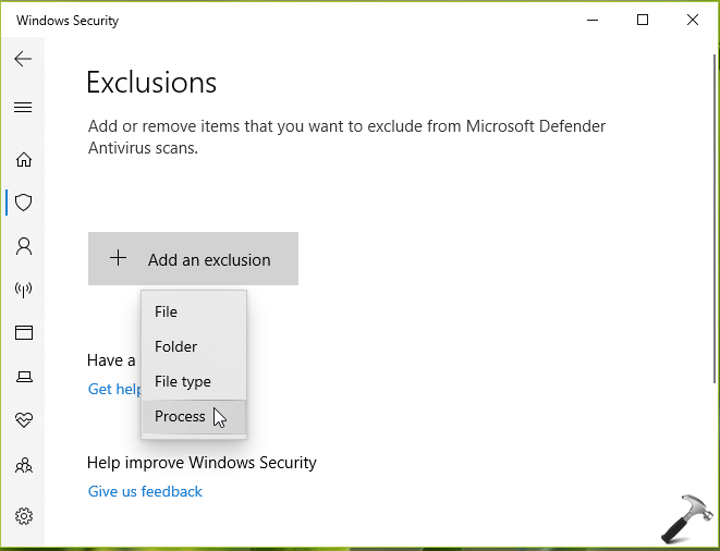 4.Ezután kattintson a Kizárás hozzáadása lehetőségre, és válassza kiFolyamatlegördülő menüben.