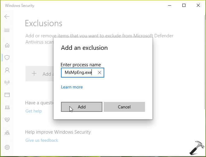 5.A Kizárás hozzáadása mezőbe írja beMsMpEng.exeés kattintsonHozzáadás.