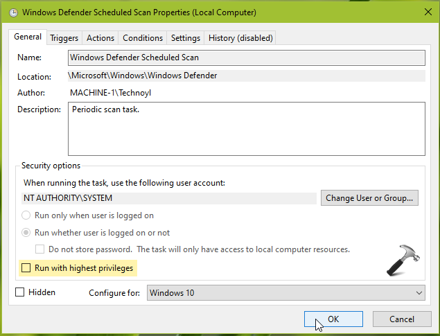 4.Továbblépve az Általános lapon törölje a jelölést a Futtatás legmagasabb jogosultságokkal jelölőnégyzetből.