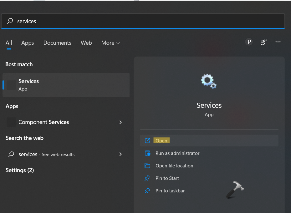 1.Nyissa ki aSzolgáltatásalkalmazáson keresztülWindows Search- BeírszolgáltatásÉs akkor kattintson a gombraNyitott-
