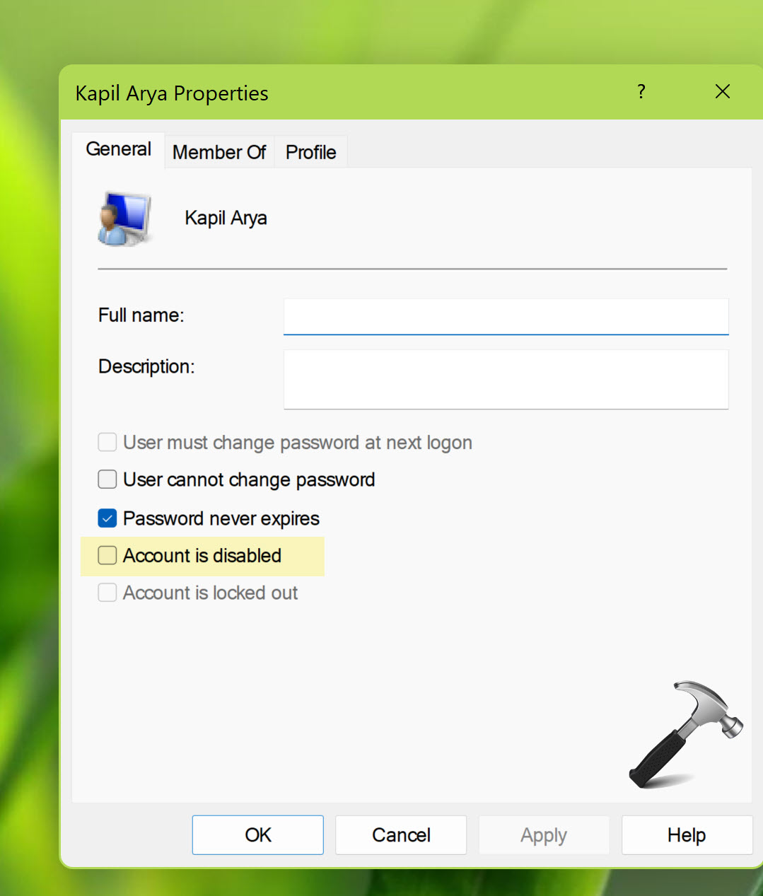 - Az ingatlanlapon, amikor az Általános lapon van, ellenőrizze, hogyA fiók le van tiltvaopció azellenőrizetlenül-