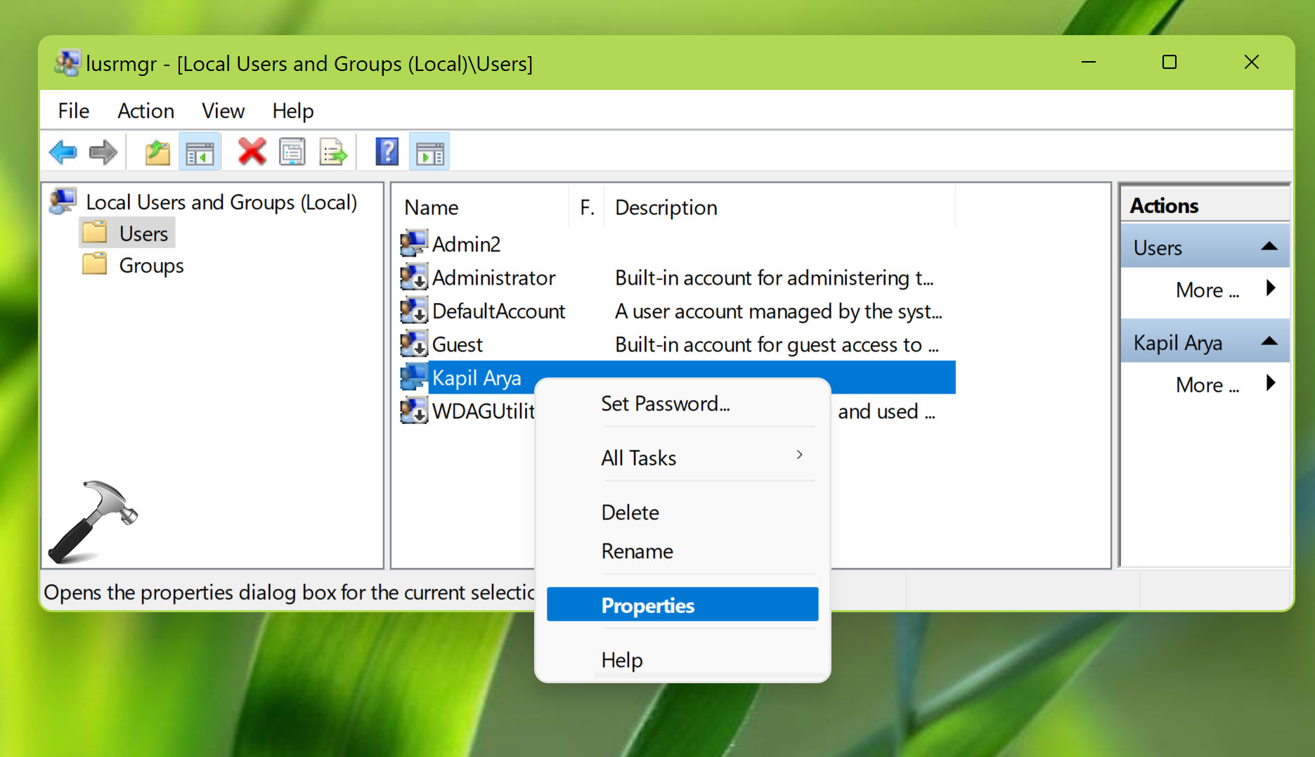 lusrmgr.mscés kattintson az OK gombra. - A helyi felhasználókban és csoportokban a Snap-In, az Open felhasználók mappáját, és a jobb egérgombbal kattintson a másik felhasználói fiókra, amelyre nem válthat. VálasszonTulajdonságok-