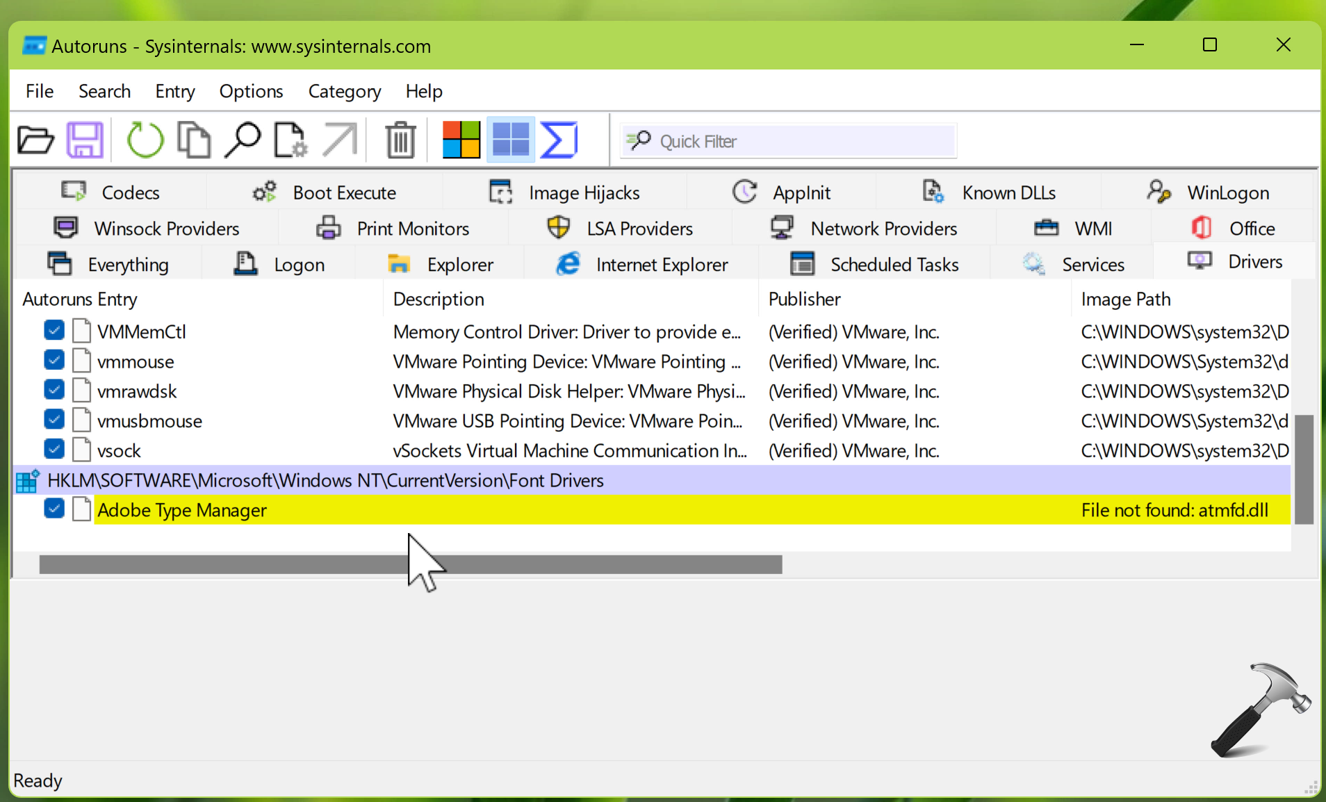 3. Most, amikor az Autoruns elindul, lépjen a Drivers fülre. Legyen a járművezetők listája.