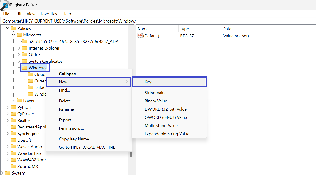 HKEY_CURRENT_USERSoftwarePoliciesMicrosoftWindows