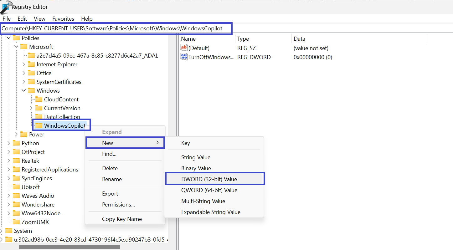 4. A rendszerleíró kulcs létrehozása után kattintson jobb gombbal a „WindowsCopilot” gombot, és válassza a „Új => Duplaszó (32 bites)“.