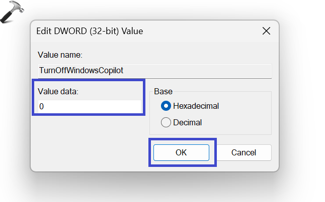 5. Most kattintson duplán a „TurnOffWindowsCopilot” gombot, és állítsa az értéket 0-ra.