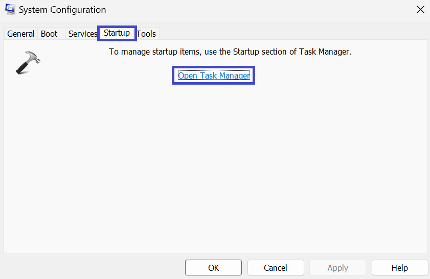 3. Most az indítási szakaszban kattintson a „Nyissa meg a Feladatkezelőt” opciót.