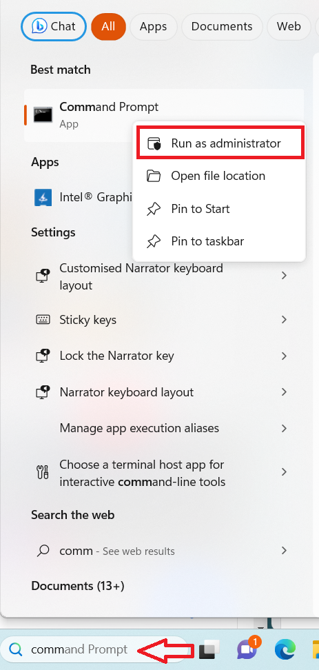 1. Keresse meg a parancssort a keresőmezőben, és kattintson a jobb gombbal a megjelenő listában látható parancssori opcióra. Ezután válassza a Run adminisztrátorként lehetőséget.