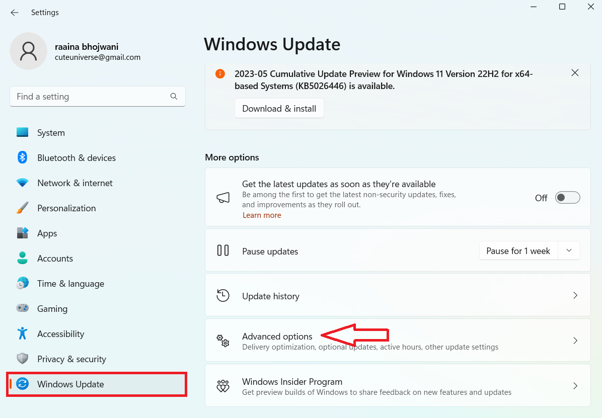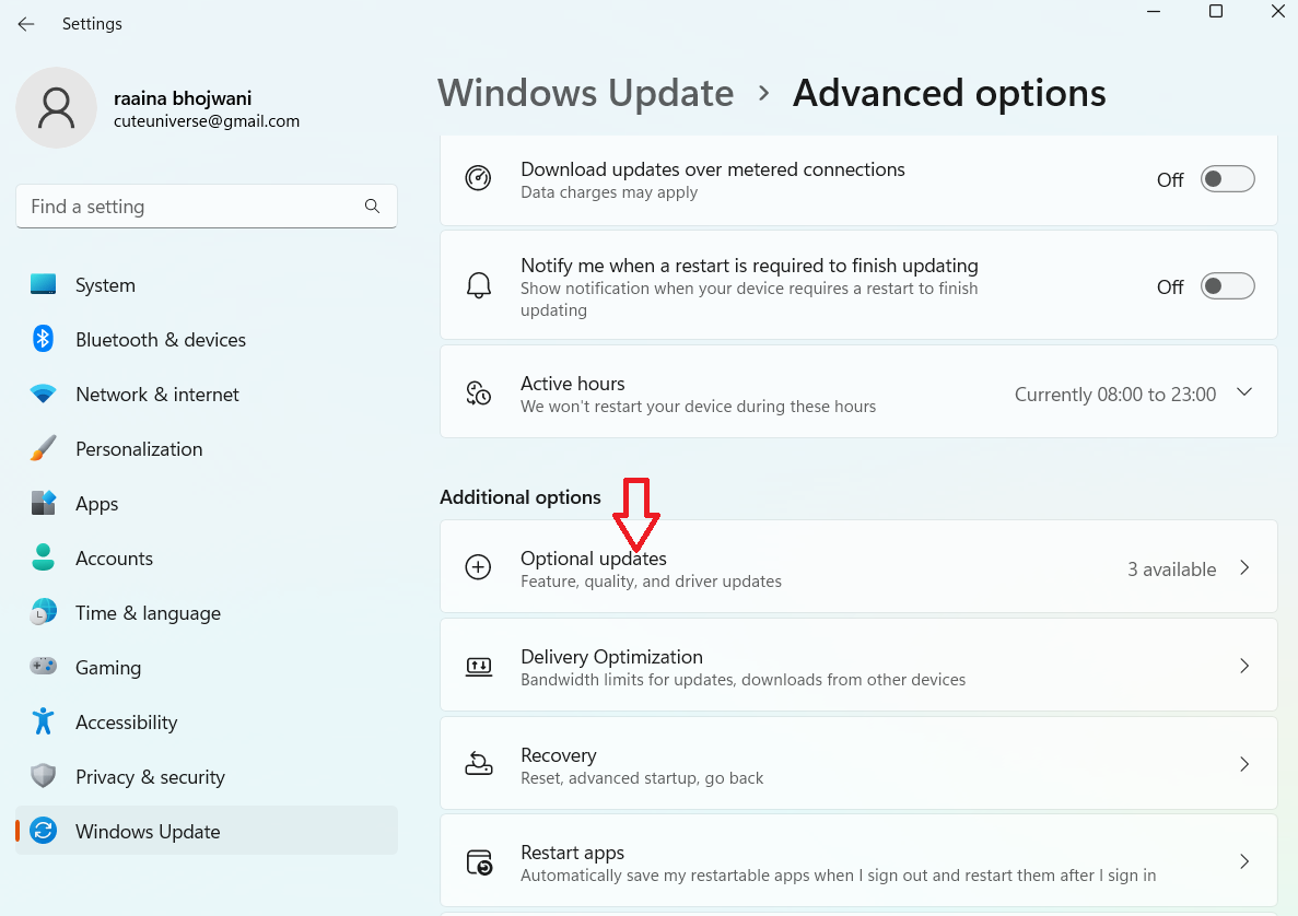 3. Következő kattintson a Speciális beállításokra, majd kattintson az Opcionális Frissítések elemre.
