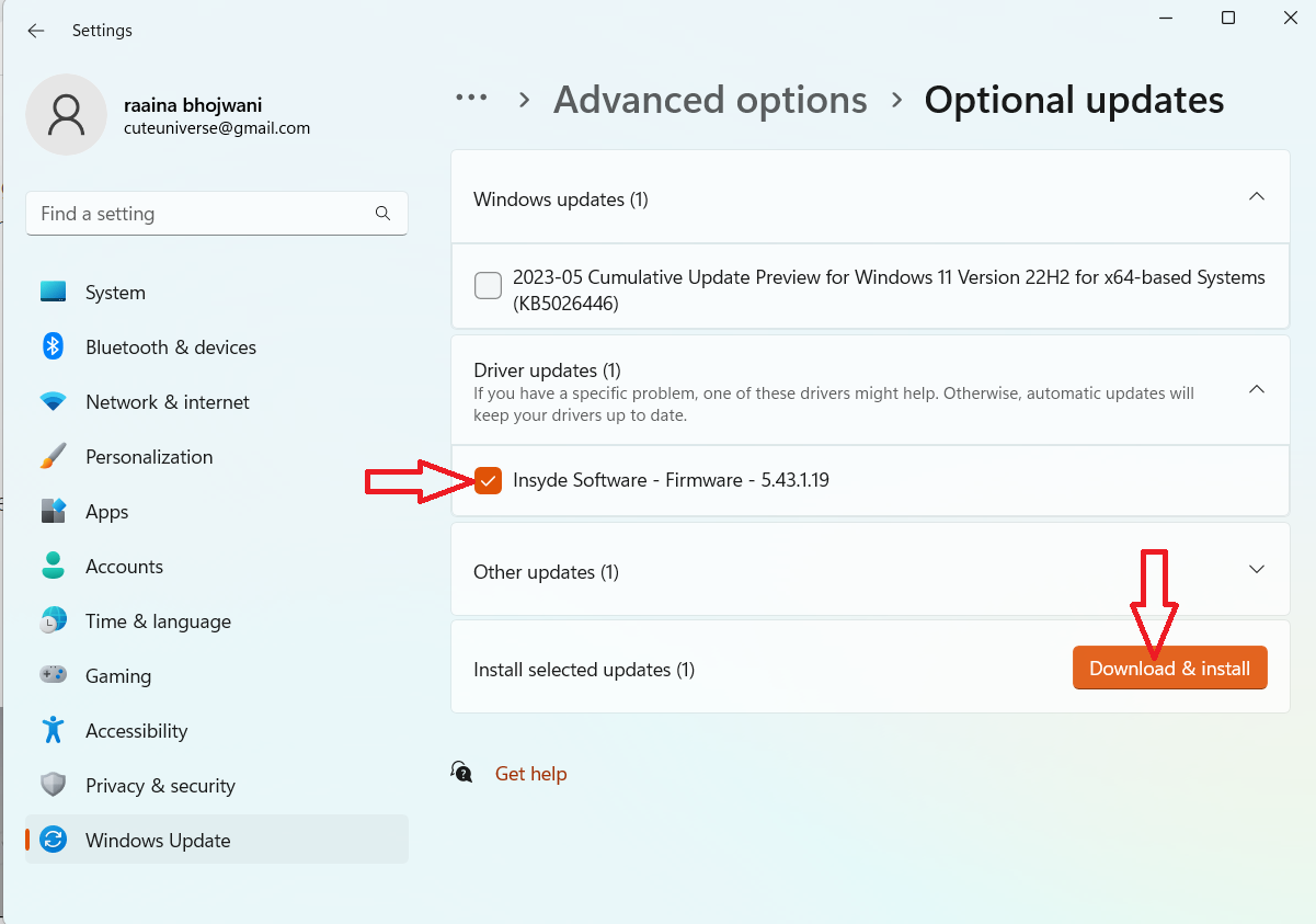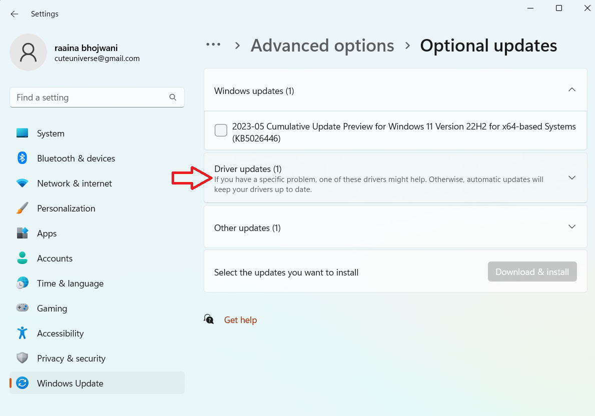 5. Ezután jelölje be az illesztőprogram -frissítések szakasz alatt megjelenő jelölőnégyzeteket, majd kattintson a Letöltés és telepítés elemre.