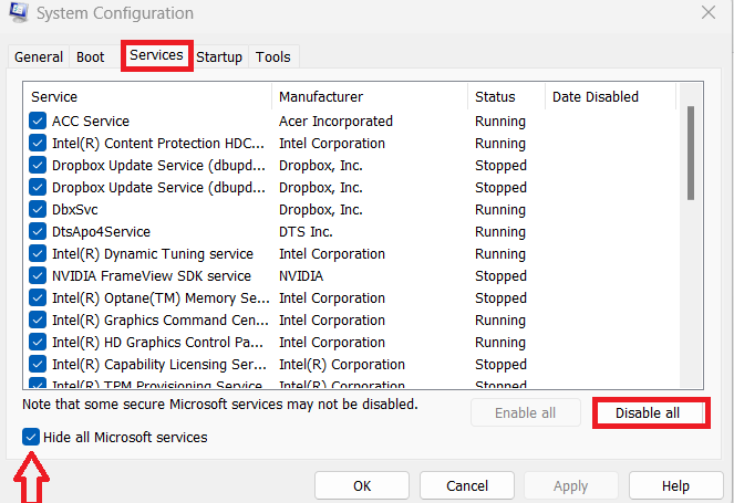 2. Ezután kattintson a Szolgáltatások fülre, és jelölje be az összes Microsoft Services jelölőnégyzet elrejtését, majd kattintson az összes letiltására.