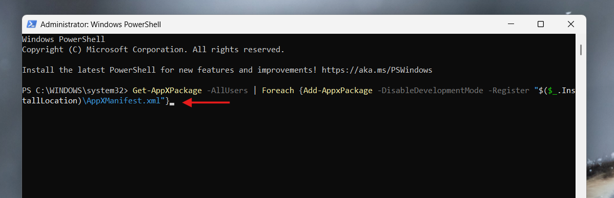 Get-AppXPackage -AllUsers | Foreach {Add-AppxPackage -DisableDevelopmentMode -Register "$($_.InstallLocation)AppXManifest.xml"}3. Miután befejezte, indítsa újra a számítógépet.
