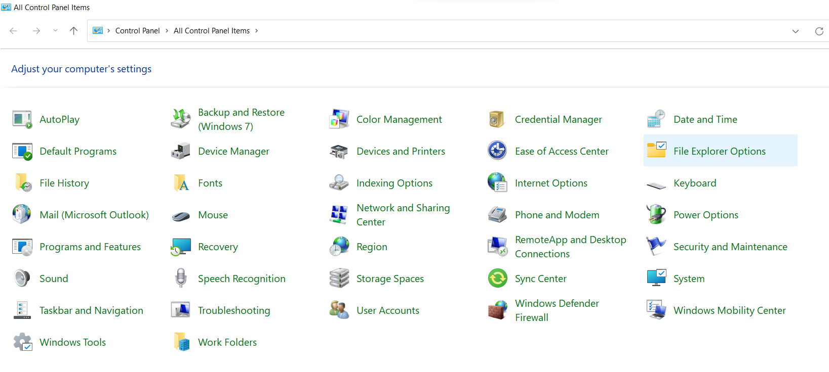 1. lépés: Nyisd megVezérlőpultA Start menüből, és változtassa meg a nézetet kategóriáról nagy ikonokra. Ezután válassza kiFile Explorer beállítások-