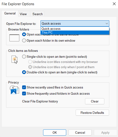 2. lépés: Az Általános lapon megváltoztatjuk a Open File Explorer opciót. Bármelyik lehetőséget is kiválasztja itt, változtassa meg a másikra. Ha a gyors hozzáférésre van állítva, változtassa meg erre a számítógépre. Ha az alapértelmezés ez a PC, akkor változtassa meg a gyors hozzáférésre.
