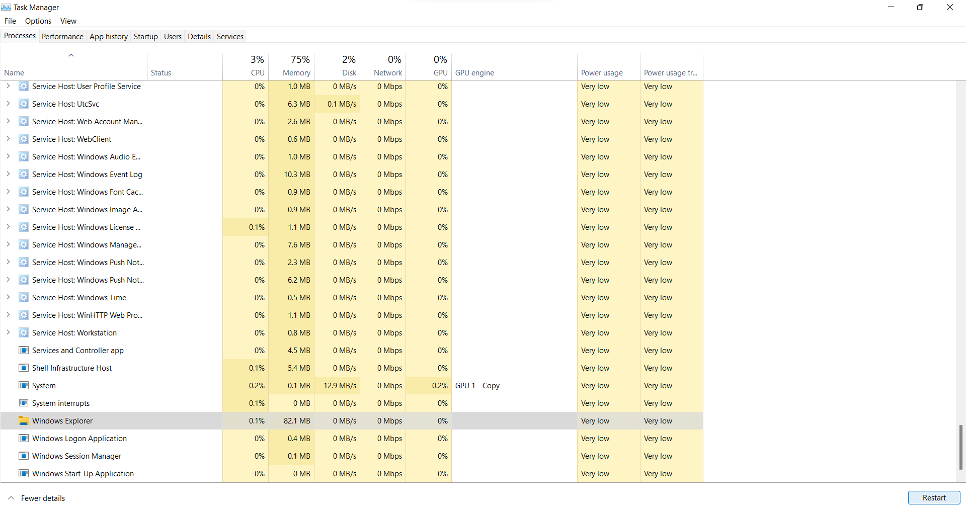 2. lépés: A Task Manager ablakban lesz a folyamatok listája. VálasszonWindows IntézőEbből a listából, és kattintson aÚjraindítgomb.