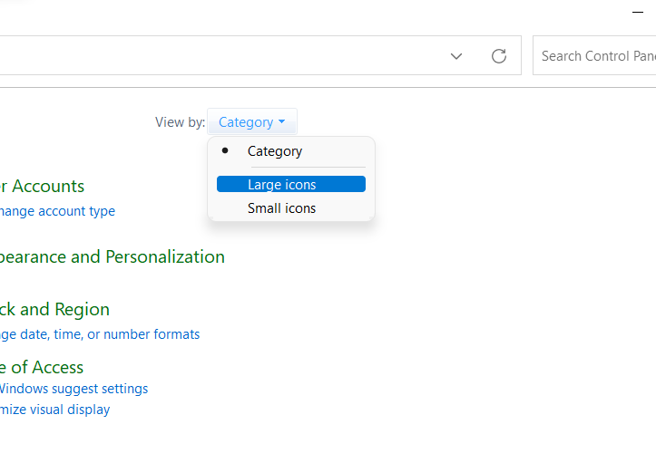 1. lépés: Nyissa meg a kezelőpanelt a Start menüből. Változtassa meg a nézetetKategória-hozNagy ikonok-