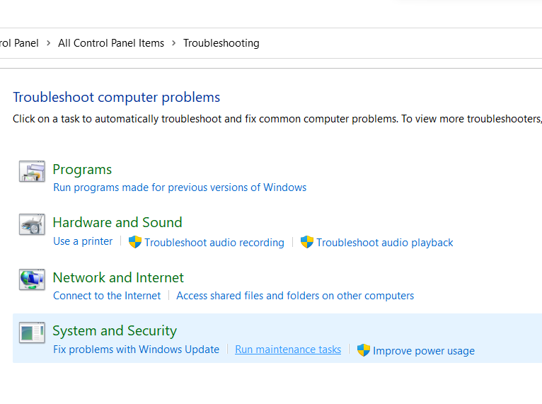 3. lépés: A megnyitó menüben kattintson a gombraKarbantartási feladat futtatásaaRendszer és biztonságszakasz.