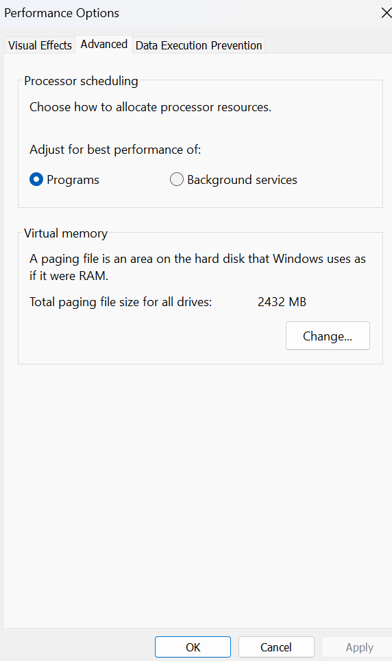 - Ezután érintse meg aVáltozás gombaVirtuális memória dobozaHaladó fül-