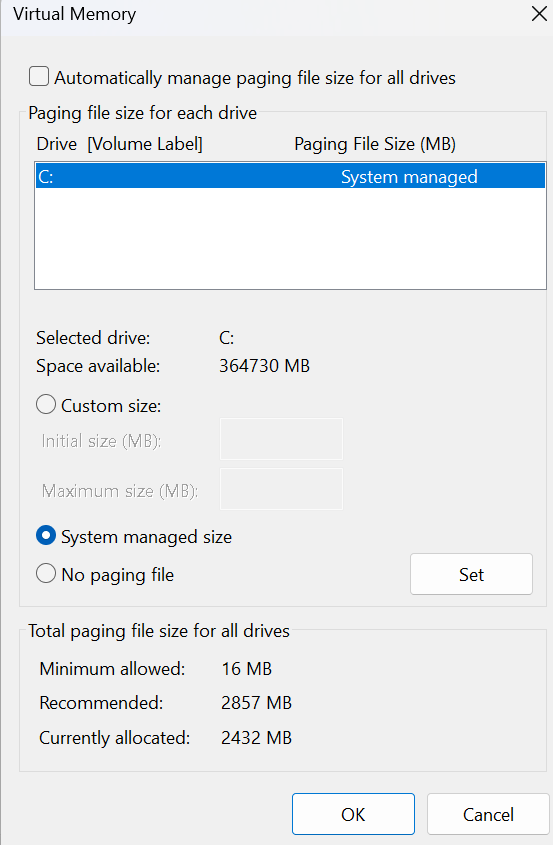 2. javítás - Optimalizálja a virtuális memóriát a nagy hardver fenntartott memória javításához a Windows 11 -ben