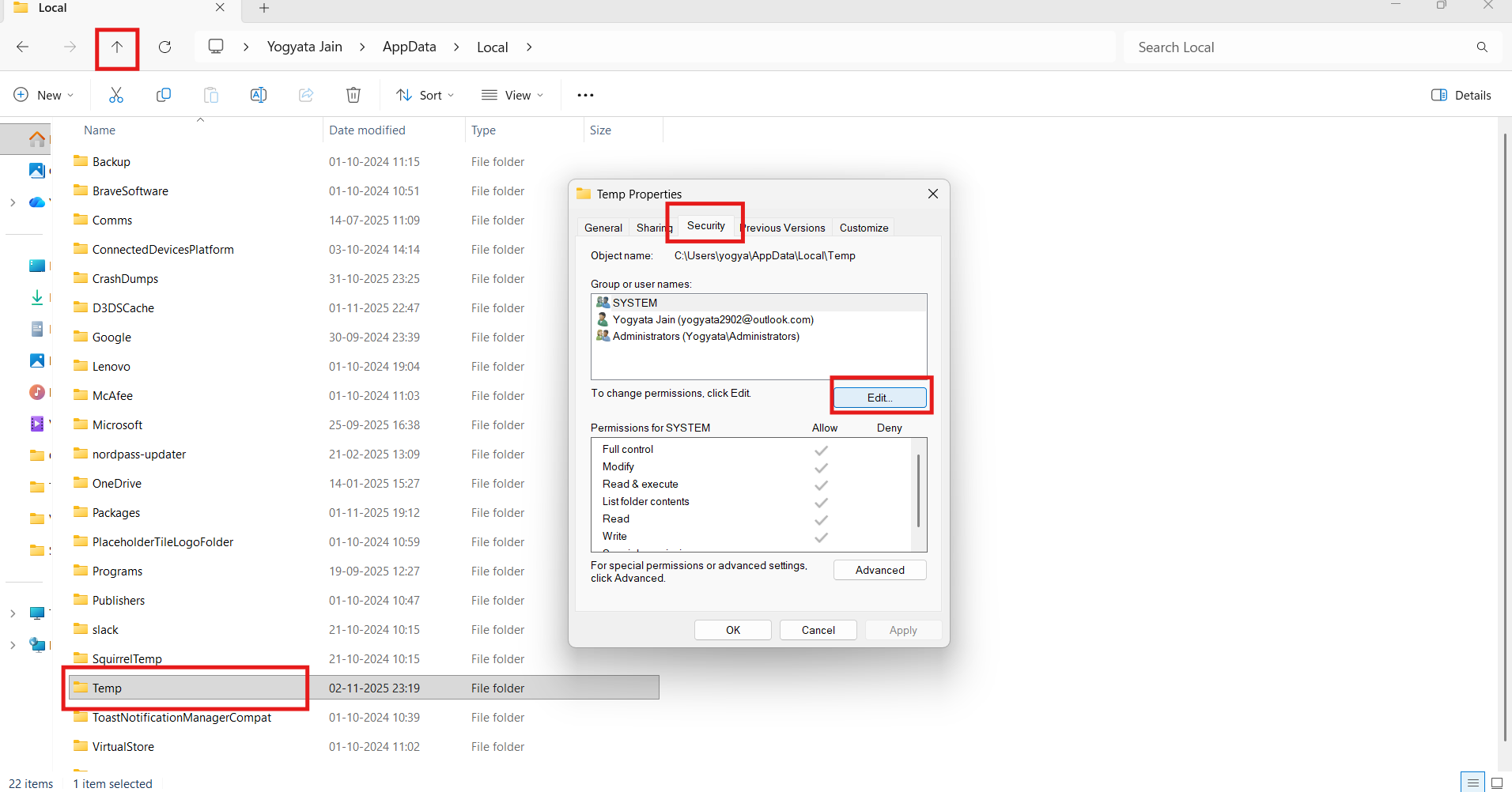 1. javítás: A Temp mappa engedélyeinek módosítása