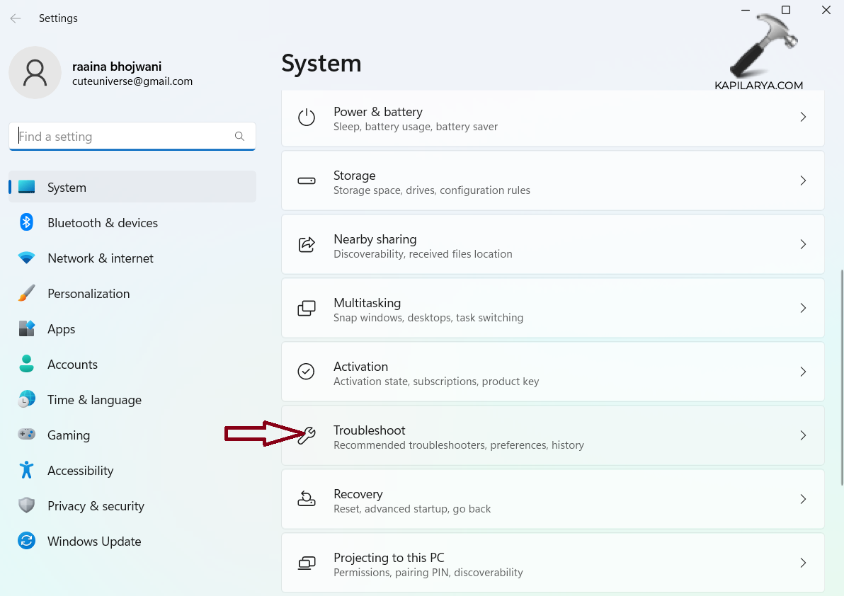 2. Kattintson a „Hibaelhárítás” elemre.